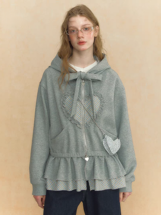 LOLOL. Original Design Layered Look Heart Print Zip-Up Hoodie
