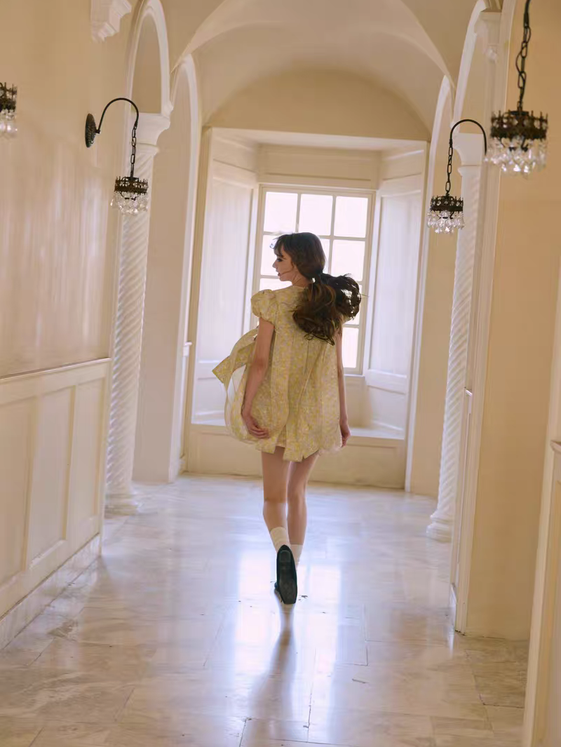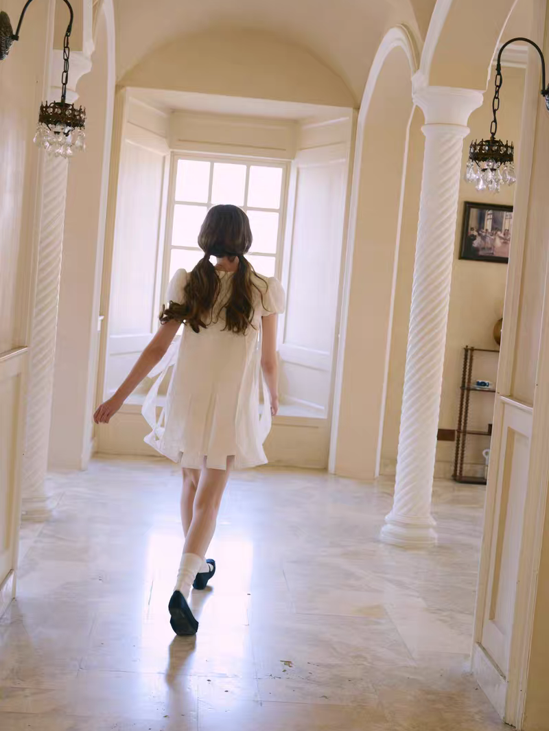 PER PEARL. Original Design Embroider Puff Sleeve Dress with Ribbon Details